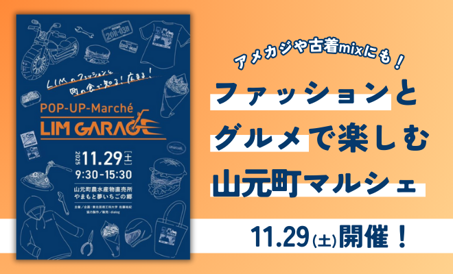 宮城県南部にある山元町の農水産物直売所やまもと夢いちごの郷で2025年11月29日、山元発のアパレルブランド「LIM(LIFE IS MIRACLE)」のマルシェイベント「POP-UP-Marche LIM GARAGE」が開かれます。