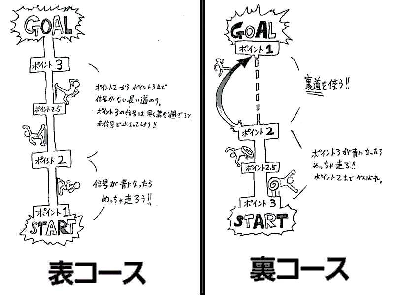 以下の図は、表コースと裏コースのポイントとなる点をまとめたものになります。