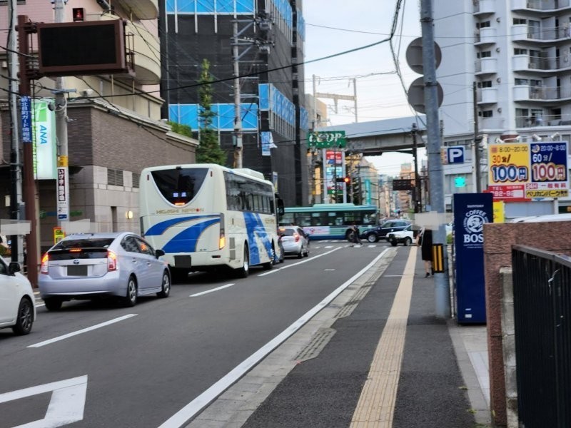さて、ポイント2.5です。信号がなくてスムーズに渡れるじゃん!と油断してはいけません。ここは近くに車庫があるのでバスが通ります。当日現場には警備員さんがいらっしゃって、歩行者を優先して渡らせてくれることもありました。